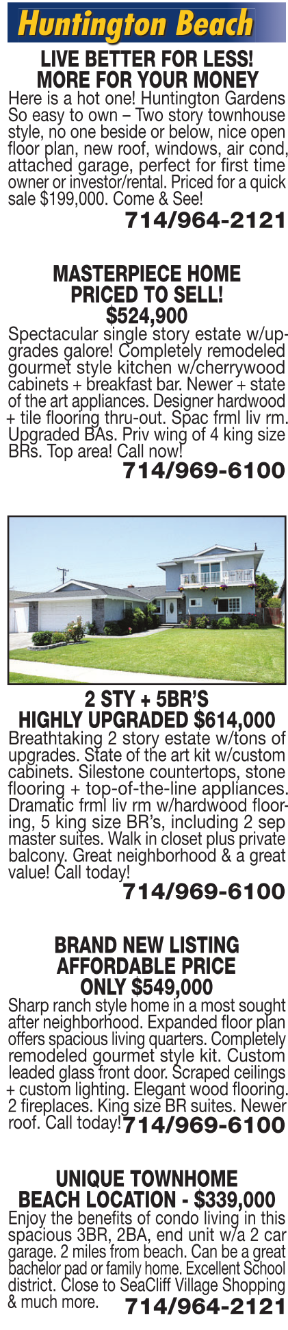 UNIQUE TOWNHOME BEACH LOCATION - $339,000 Enjoy the benefits of condo living in this spacious 3BR, 2BA, end unit w/a 2 car garage. 2 miles from beach. Can be a great bachelor pad or family home. Excellent School district. Close to SeaCliff Village Shopping & much more. 714/964-2121