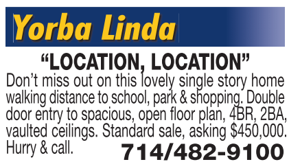 Yorba Linda “LOCATION, LOCATION” Don’t miss out on this lovely single story home walking distance to school, park & shopping. Double door entry to spacious, open floor plan, 4BR, 2BA, vaulted ceilings. Standard sale, asking $450,000. Hurry & call. 714/482-9100