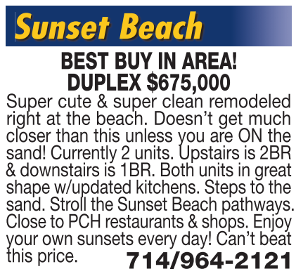 DUPLEX $675,000 Super cute & super clean remodeled right at the beach. Doesn’t get much closer than this unless you are ON the sand! Currently 2 units. Upstairs is 2BR & downstairs is 1BR. Both units in great shape w/updated kitchens. Steps to the sand. Stroll the Sunset Beach pathways. Close to PCH restaurants & shops. Enjoy your own sunsets every day! Can’t beat this price. 714/964-2121