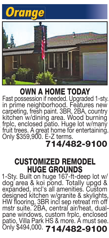 footage. bright, floors, Orange OWN A HOME TODAY Fast possession if needed. Upgraded 1-sty. in prime neighborhood. Features new carpeting, fresh paint. 3BR, 2BA, country kitchen w/dining area. Wood burning frplc, enclosed patio. Huge lot w/many fruit trees. A great home for entertaining. Only $359,900. E-Z terms. 714/482-9100 CUSTOMIZED REMODEL HUGE GROUNDS 1-Sty. Built on huge 167-ft-deep lot w/ dog area & koi pond. Totally upgd & expanded, incl's all amenities. Custom designed kitchen w/granite & skylights, HW flooring, 3BR incl sep retreat rm off mstr suite. 2BA, central air/heat, dualpane windows, custom frplc, enclosed patio, Villa Park HS & more. A must see. Only $494,000. 714/482-9100