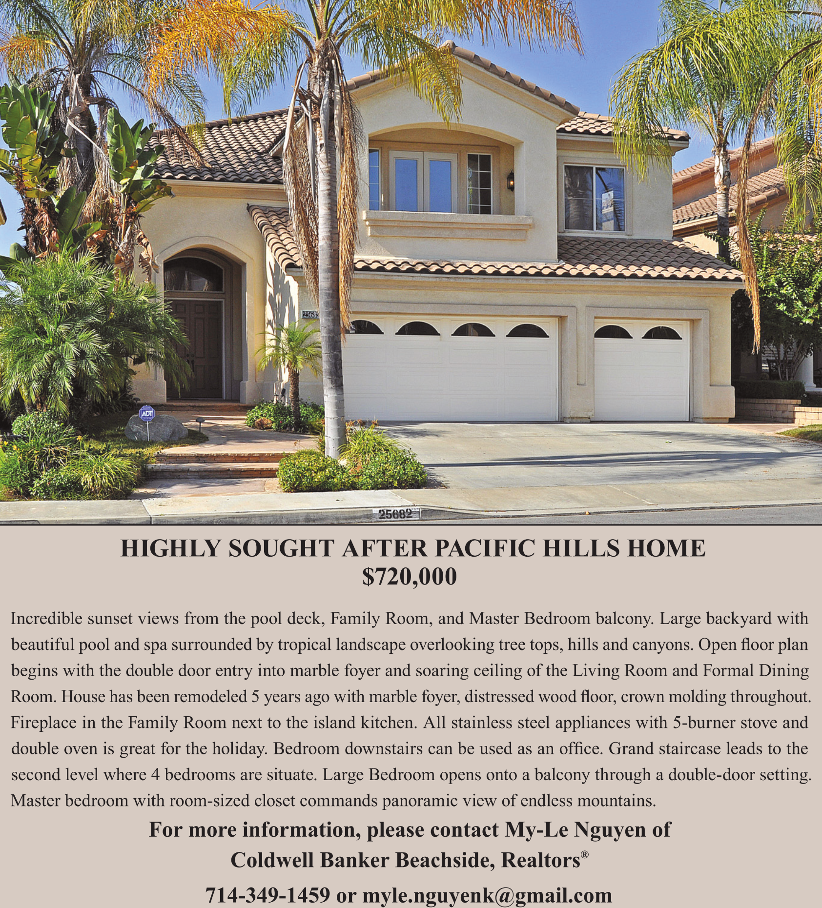 HIGHLY SOUGHT AFTER PACIFIC HILLS HOME $720,000 Incredible sunset views from the pool deck, Family Room, and Master Bedroom balcony. Large backyard with beautiful pool and spa surrounded by tropical landscape overlooking tree tops, hills and canyons. Open floor plan begins with the double door entry into marble foyer and soaring ceiling of the Living Room and Formal Dining Room. House has been remodeled 5 years ago with marble foyer, distressed wood floor, crown molding throughout. Fireplace in the Family Room next to the island kitchen. All stainless steel appliances with 5-burner stove and double oven is great for the holiday. Bedroom downstairs can be used as an office. Grand staircase leads to the second level where 4 bedrooms are situate. Large Bedroom opens onto a balcony through a double-door setting. Master bedroom with room-sized closet commands panoramic view of endless mountains. For more information, please contact My-Le Nguyen of Coldwell Banker Beachside, Realtors ® 714-349-1459 or myle.nguyenk@gmail.com