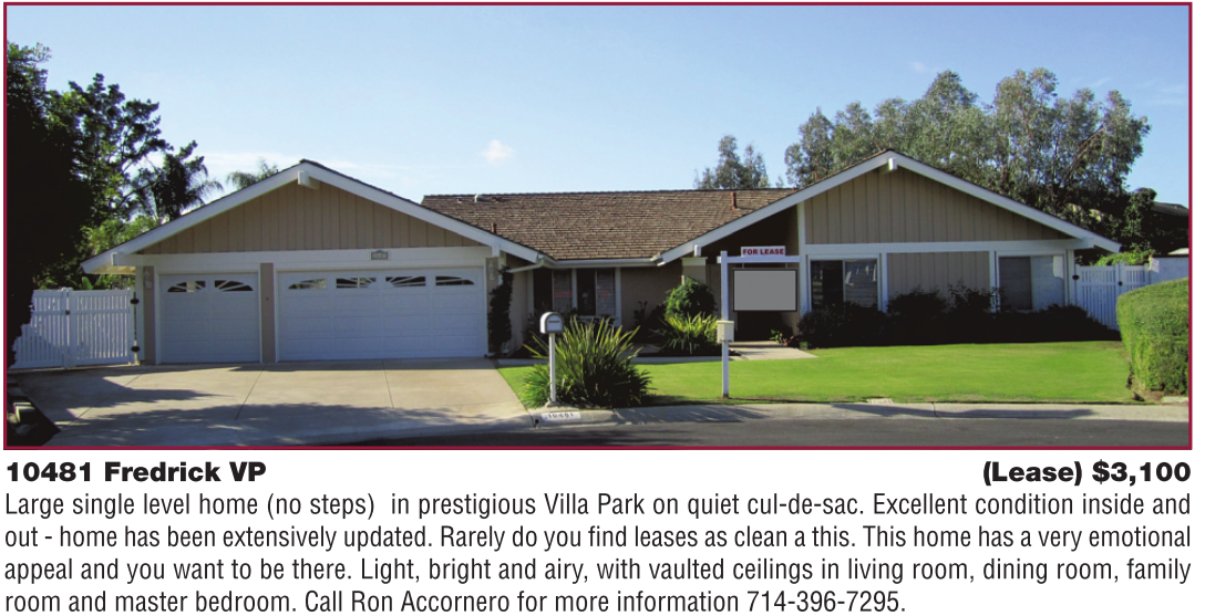10481 Fredrick VP (Lease) $3,100 Large single level home (no steps) in prestigious Villa Park on quiet cul-de-sac. Excellent condition inside and out - home has been extensively updated. Rarely do you find leases as clean a this. This home has a very emotional appeal and you want to be there. Light, bright and airy, with vaulted ceilings in living room, dining room, family room and master bedroom. Call Ron Accornero for more information 714-396-7295.