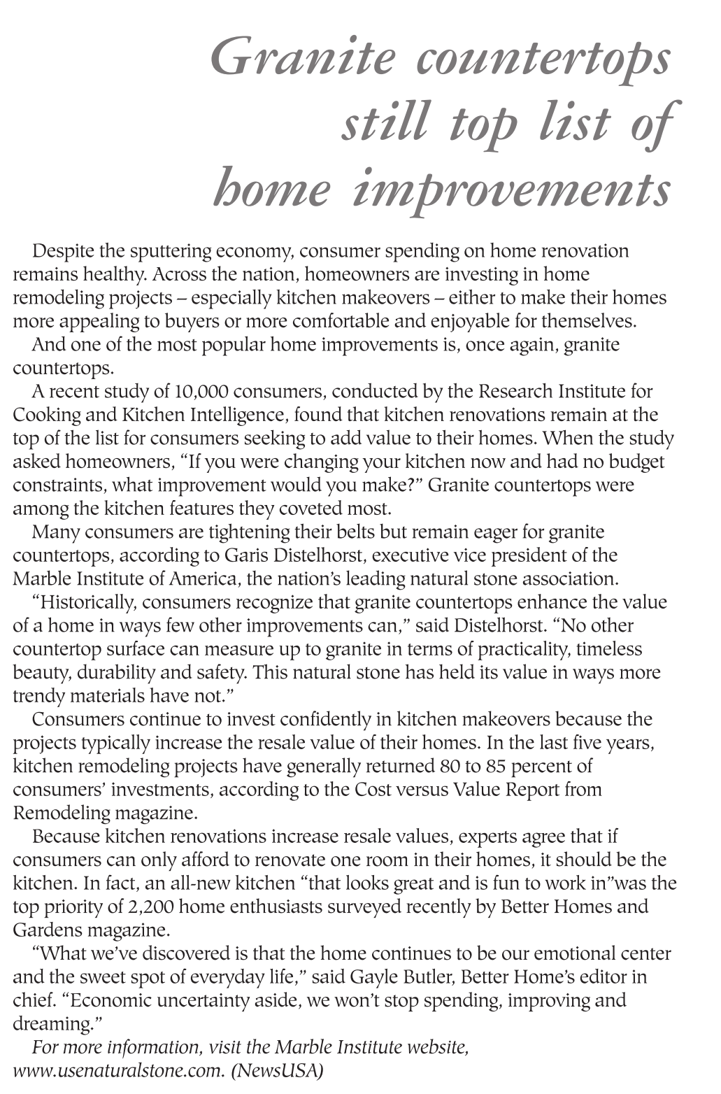 “Historically, consumers recognize that granite countertops enhance the value of a home in ways few other improvements can,” said Distelhorst. “No other countertop surface can measure up to granite in terms of practicality, timeless beauty, durability and safety. This natural stone has held its value in ways more trendy materials have not.”