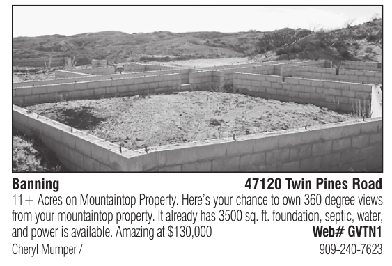 Banning 47120 Twin Pines Road 11+ Acres on Mountaintop Property. Here’s your chance to own 360 degree views from your mountaintop property. It already has 3500 sq. ft. foundation, septic, water, and power is available. Amazing at $130,000 Web# GVTN1 Cheryl Mumper / 909-240-7623