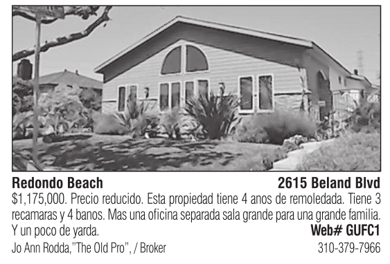 Redondo Beach 2615 Beland Blvd $1,175,000. Precio reducido. Esta propiedad tiene 4 anos de remoledada. Tiene 3 recamaras y 4 banos. Mas una oficina separada sala grande para una grande familia. Y un poco de yarda. Web# GUFC1 Jo Ann Rodda,”The Old Pro”, / Broker 310-379-7966