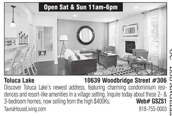 Discover Toluca Lake’s newest address, featuring charming condominium residences and resort-like amenities in a village setting. Inquire today about these 2- & 3-bedroom homes, now selling from the high $400Ks. Web# GSZS1 TaviraHouseLiving.com 818-755-0003