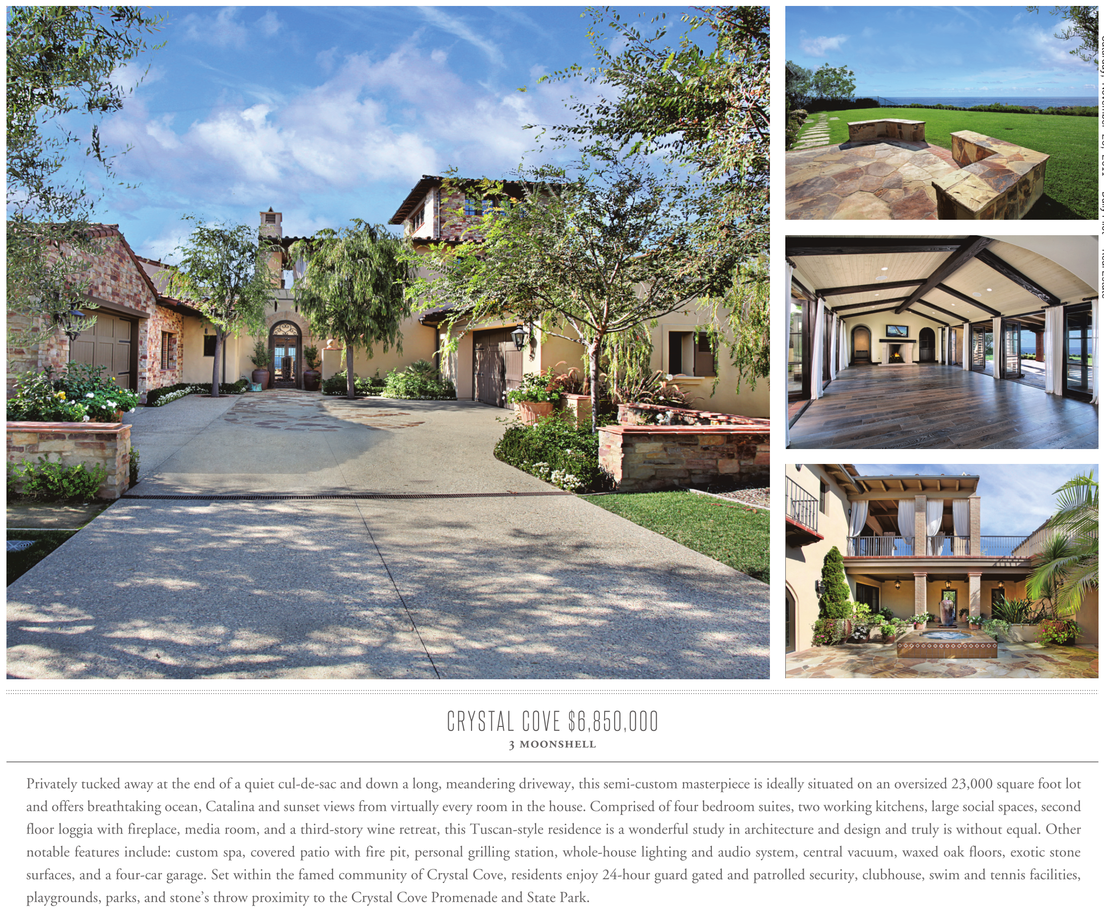 Privately tucked away at the end of a quiet cul-de-sac and down a long, meandering driveway, this semi-custom masterpiece is ideally situated on an oversized 23,000 square foot lot and offers breathtaking ocean, Catalina and sunset views from virtually every room in the house. Comprised of four bedroom suites, two working kitchens, large social spaces, second floor loggia with fireplace, media room, and a third-story wine retreat, this Tuscan-style residence is a wonderful study in architecture and design and truly is without equal. Other notable features include: custom spa, covered patio with fire pit, personal grilling station, whole-house lighting and audio system, central vacuum, waxed oak floors, exotic stone surfaces, and a four-car garage. Set within the famed community of Crystal Cove, residents enjoy 24-hour guard gated and patrolled security, clubhouse, swim and tennis facilities, playgrounds, parks, and stone’s throw proximity to the Crystal Cove Promenade and State Park.