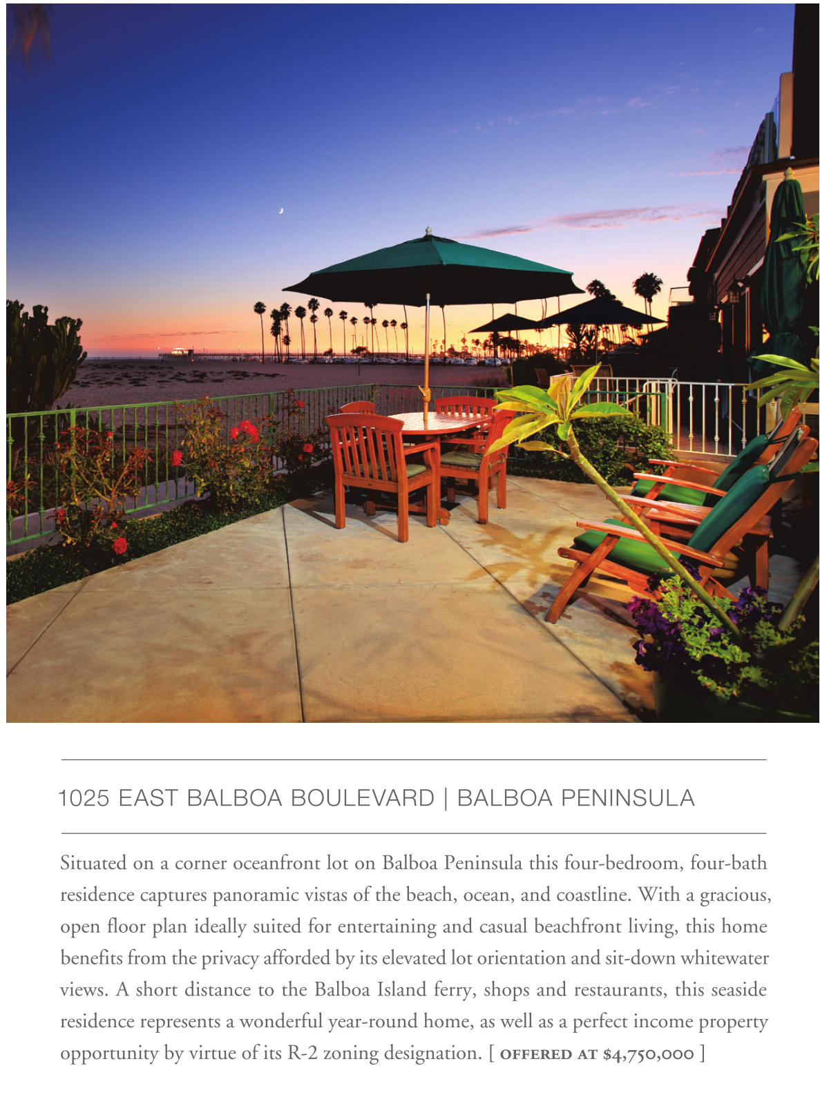 Situated on a corner oceanfront lot on Balboa Peninsula this four-bedroom, four-bath residence captures panoramic vistas of the beach, ocean, and coastline. With a gracious, open floor plan ideally suited for entertaining and casual beachfront living, this home benefits from the privacy afforded by its elevated lot orientation and sit-down whitewater views. A short distance to the Balboa Island ferry, shops and restaurants, this seaside residence represents a wonderful year-round home, as well as a perfect income property opportunity by virtue of its R-2 zoning designation. [ offered at $4,750,000 ]