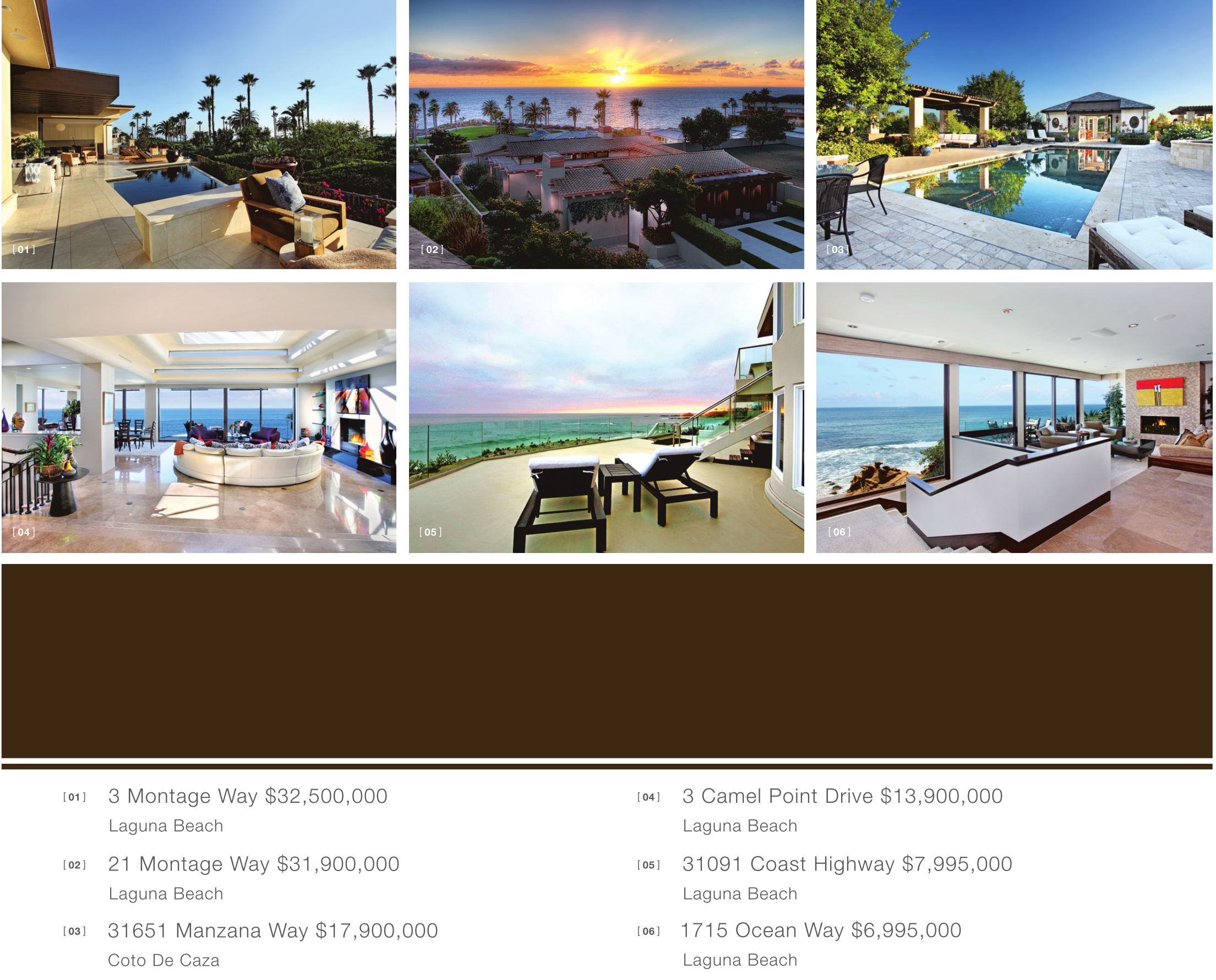 [ 01 ] [ 02 ] [ 03 ] [ 04 ] [ 05 ] [ 06 ] [ 01 ] [ 02 ] [ 03 ] 3 Montage Way $32,500,000 Laguna Beach 21 Montage Way $31,900,000 Laguna Beach 31651 Manzana Way $17,900,000 Coto De Caza [ 04 ] [ 05 ] [ 06 ] 3 Camel Point Drive $13,900,000 Laguna Beach 31091 Coast Highway $7,995,000 Laguna Beach 1715 Ocean Way $6,995,000 Laguna Beach