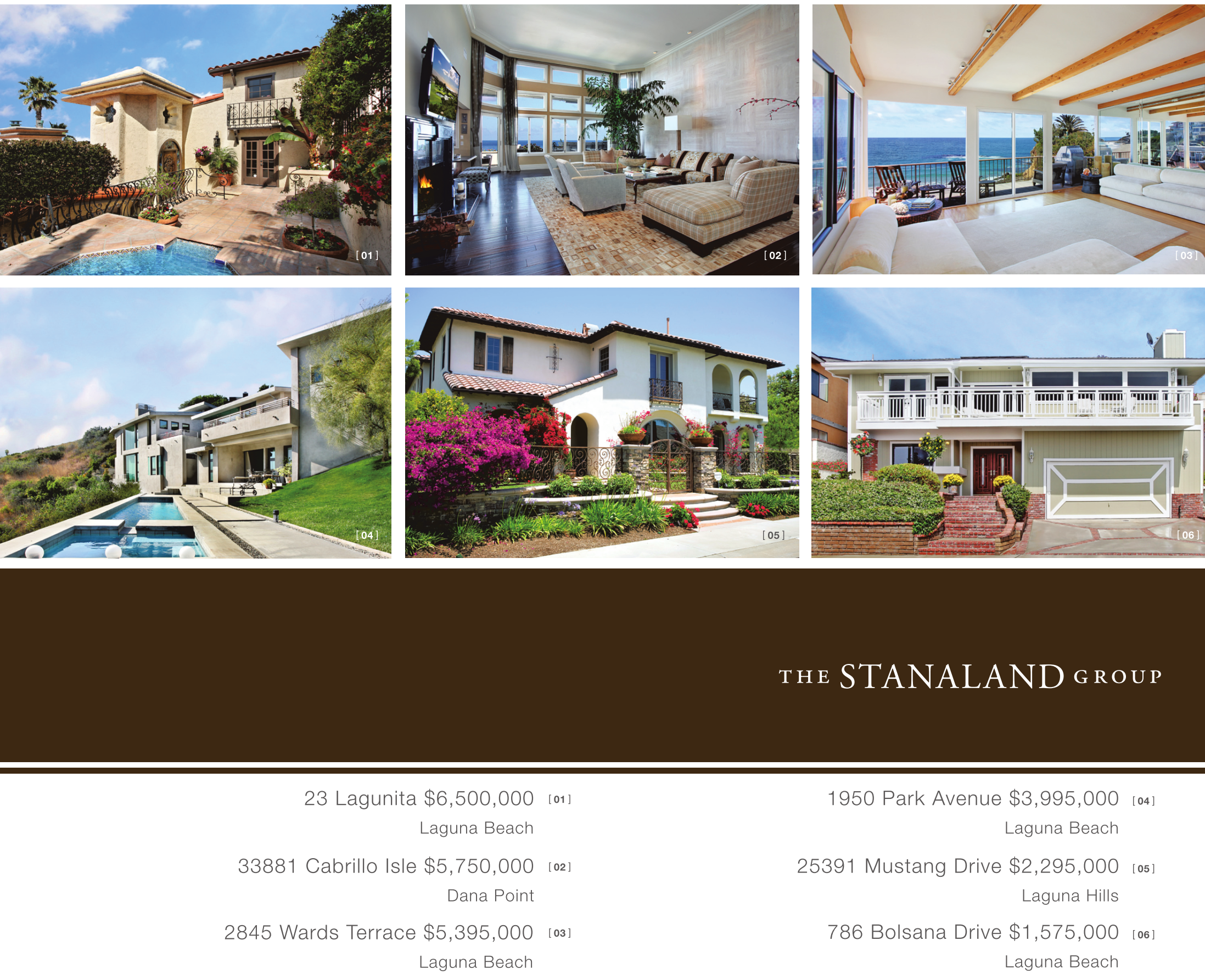 [ 01 ] [ 02 ] [ 03 ] [ 04 ] [ 05 ] [ 06 ] 23 Lagunita $6,500,000 Laguna Beach 33881 Cabrillo Isle $5,750,000 Dana Point 2845 Wards Terrace $5,395,000 Laguna Beach [ 01 ] [ 02 ] [ 03 ] 1950 Park Avenue $3,995,000 Laguna Beach 25391 Mustang Drive $2,295,000 Laguna Hills 786 Bolsana Drive $1,575,000 Laguna Beach [ 04 ] [ 05 ] [ 06 ]