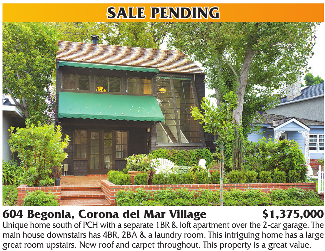 SALE PENDING 604 Begonia, Corona del Mar Village $1,375,000 Unique home south of PCH with a separate 1BR & loft apartment over the 2-car garage. The main house downstairs has 4BR, 2BA & a laundry room. This intriguing home has a large great room upstairs. New roof and carpet throughout. This property is a great value.