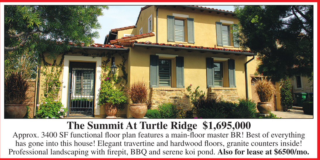 The Summit At Turtle Ridge $1,695,000 Approx. 3400 SF functional floor plan features a main-floor master BR! Best of everything has gone into this house! Elegant travertine and hardwood floors, granite counters inside! Professional landscaping with firepit, BBQ and serene koi pond. Also for lease at $6500/mo.