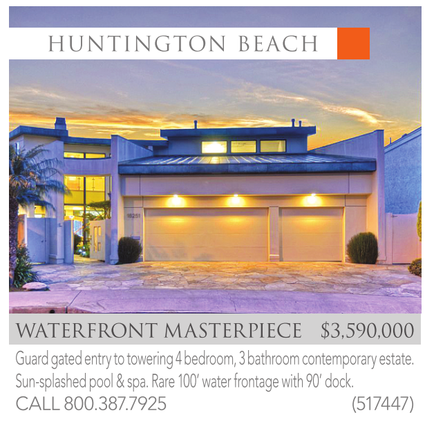 WATERFRONT MASTERPIECE $3,590,000 Guard gated entry to towering 4 bedroom, 3 bathroom contemporary estate. Sun-splashed pool & spa. Rare 100’ water frontage with 90’ dock. CALL 800.387.7925 (517447)