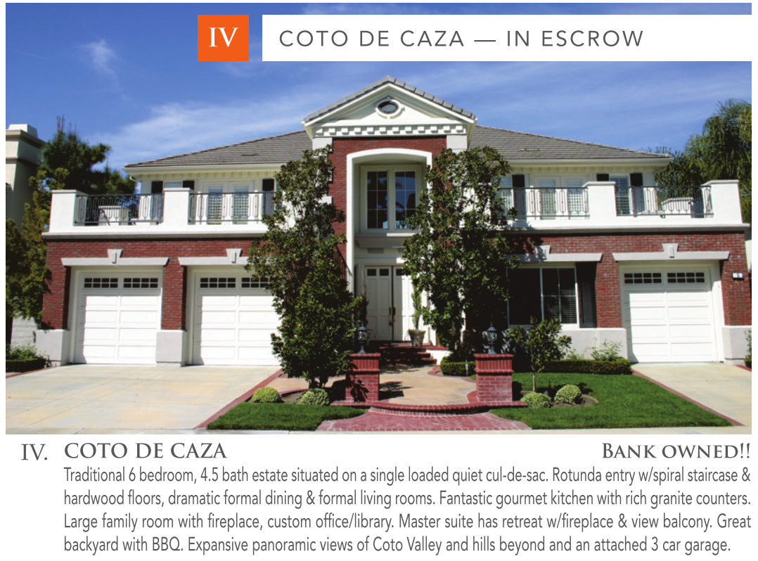 IV COTO DE CAZA — IN ESCROW IV. COTO DE CAZA Bank owned!! Traditional 6 bedroom, 4.5 bath estate situated on a single loaded quiet cul-de-sac. Rotunda entry w/spiral staircase & hardwood floors, dramatic formal dining & formal living rooms. Fantastic gourmet kitchen with rich granite counters. Large family room with fireplace, custom office/library. Master suite has retreat w/fireplace & view balcony. Great backyard with BBQ. Expansive panoramic views of Coto Valley and hills beyond and an attached 3 car garage.