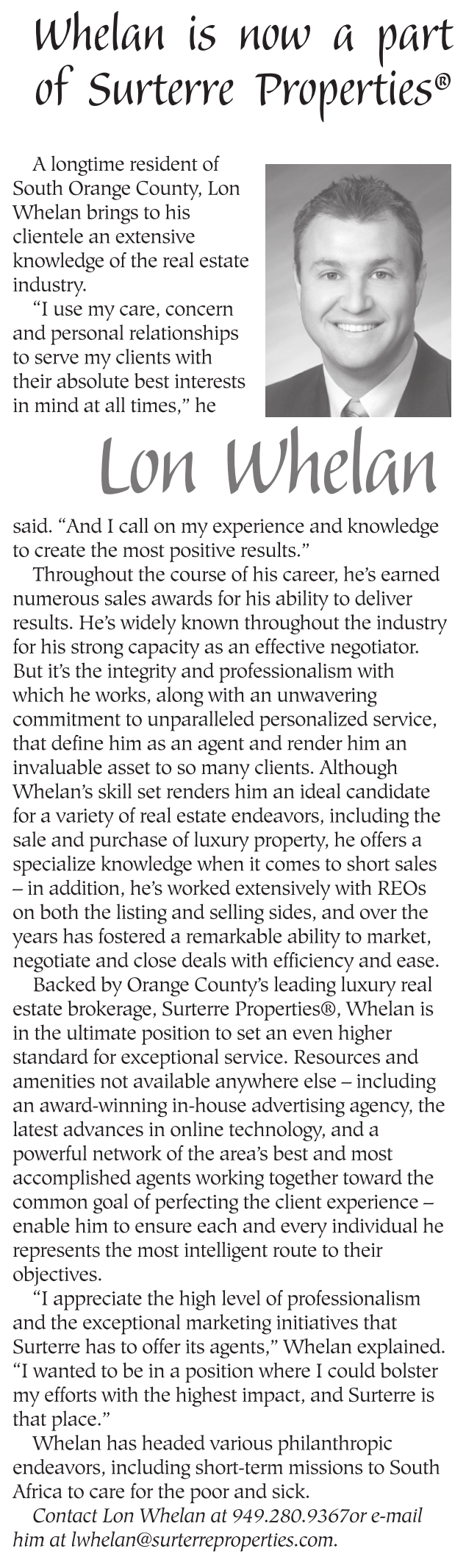 Contact Lon Whelan at 949.280.9367or e-mail him at lwhelan@surterreproperties.com.