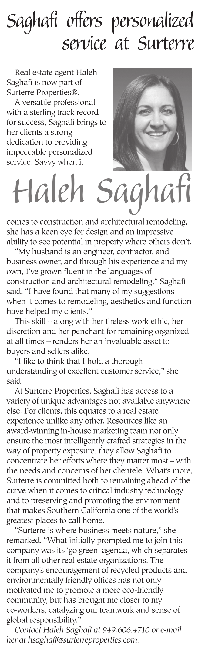 Contact Haleh Saghafi at 949.606.4710 or e-mail her at hsaghafi@surterreproperties.com.