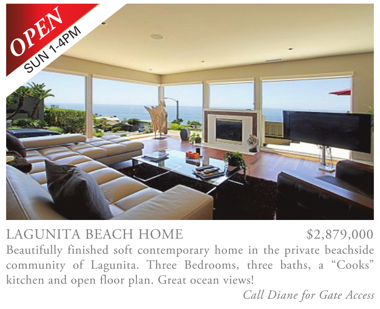 LAGUNITA BEACH HOME $2,879,000 Beautifully finished soft contemporary home in the private beachside community of Lagunita. Three Bedrooms, three baths, a “Cooks” kitchen and open floor plan. Great ocean views!