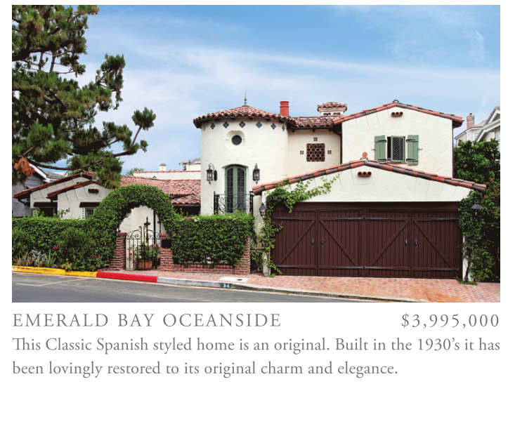 EMERALD BAY OCEANSIDE $3,995,000 This Classic Spanish styled home is an original. Built in the 1930’s it has been lovingly restored to its original charm and elegance.