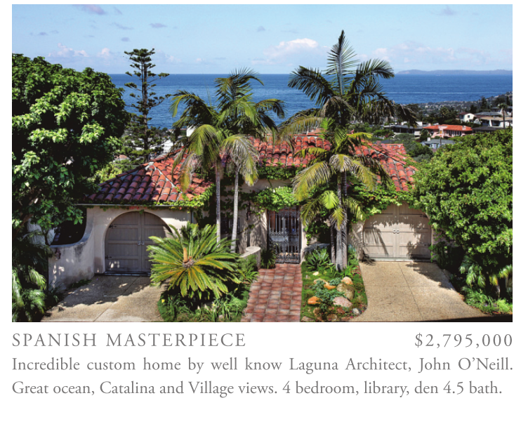 SPANISH MASTERPIECE $2,795,000 Incredible custom home by well know Laguna Architect, John O’Neill. Great ocean, Catalina and Village views. 4 bedroom, library, den 4.5 bath.