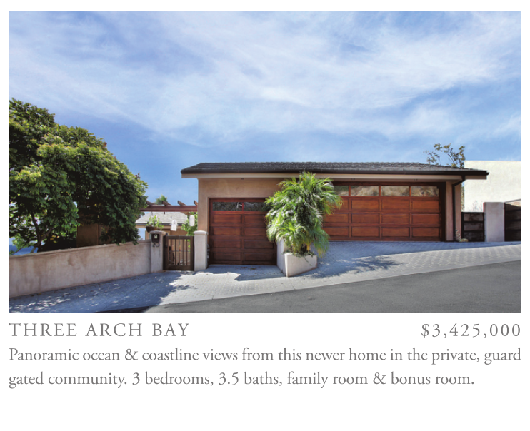 THREE ARCH BAY $3,425,000 Panoramic ocean & coastline views from this newer home in the private, guard gated community. 3 bedrooms, 3.5 baths, family room & bonus room.