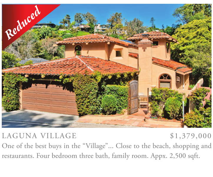 LAGUNA VILLAGE $1,379,000 One of the best buys in the “Village”... Close to the beach, shopping and restaurants. Four bedroom three bath, family room. Appx. 2,500 sqft.
