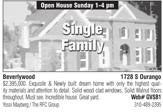 Beverlywood 1728 S Durango $2,395,000. Exquisite & Newly built dream home with only the highest quality materials and attention to detail. Solid wood clad windows. Solid Walnut floors throughout. Must see. Incredible house. Great yard. Web# GVSB1 Yossi Mayberg / The RFC Group 310-489-2395