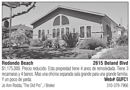 Redondo Beach 2615 Beland Blvd $1,175,000. Precio reducido. Esta propiedad tiene 4 anos de remoledada. Tiene 3 recamaras y 4 banos. Mas una oficina separada sala grande para una grande familia. Y un poco de yarda. Web# GUFC1 Jo Ann Rodda,”The Old Pro”, / Broker 310-379-7966