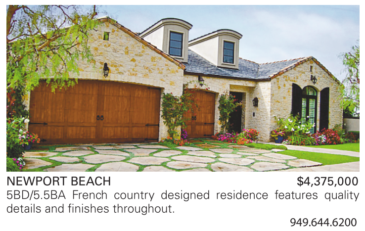 NEWPORT BEACH $4,375,000 5BD/5.5BA French country designed residence features quality details and finishes throughout.