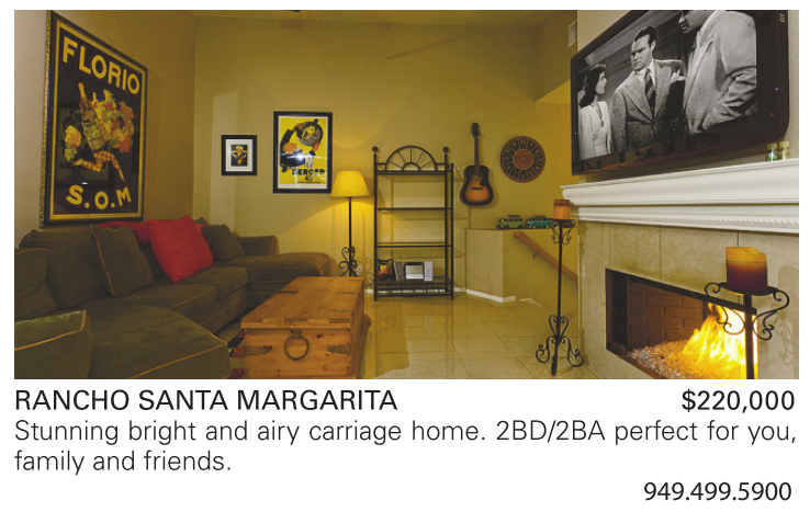 RANCHO SANTA MARGARITA $220,000 Stunning bright and airy carriage home. 2BD/2BA perfect for you, family and friends.