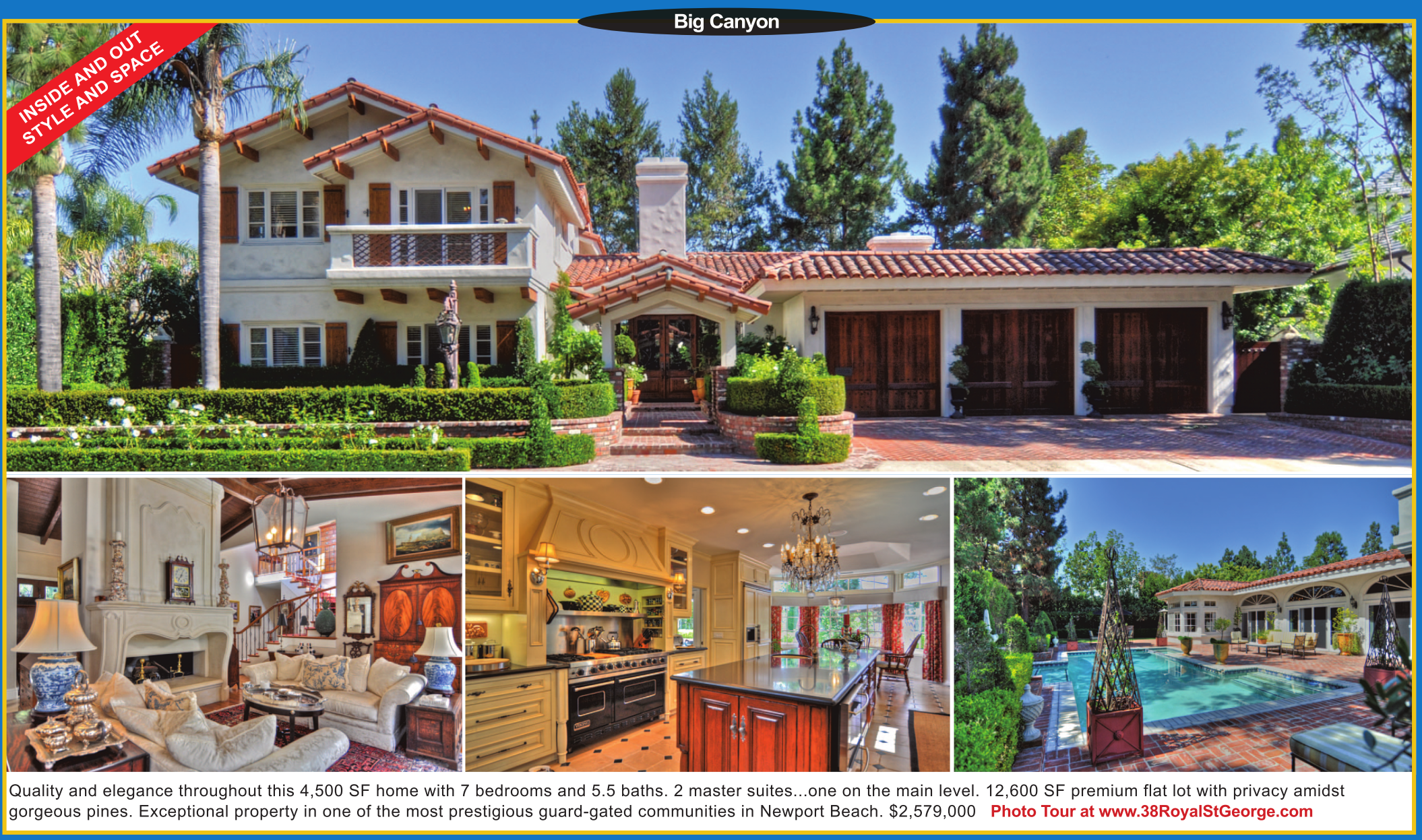 Quality and elegance throughout this 4,500 SF home with 7 bedrooms and 5.5 baths. 2 master suites...one on the main level. 12,600 SF premium flat lot with privacy amidst gorgeous pines. Exceptional property in one of the most prestigious guard-gated communities in Newport Beach. $2,579,000 Photo Tour at www.38RoyalStGeorge.com