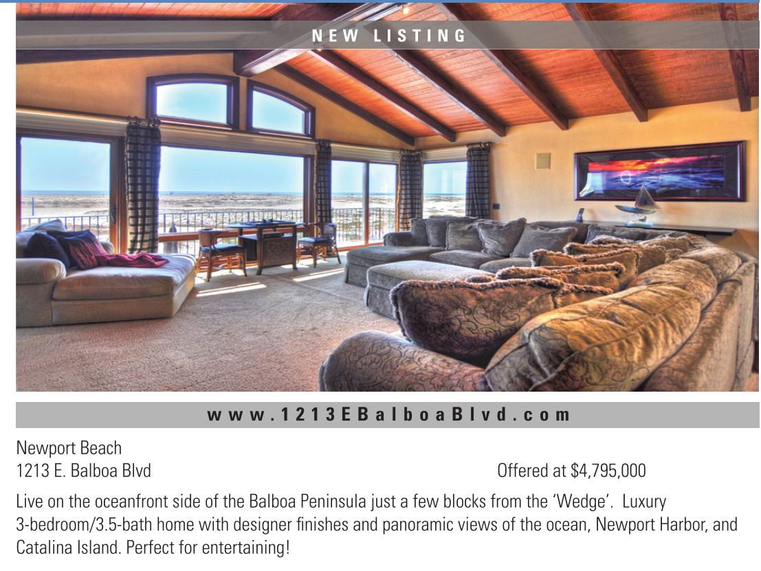 N E W L I S T I N G w w w . 1 2 1 3 E B a l b o a B l v d . c o m Newport Beach 1213 E. Balboa Blvd Offered at $4,795,000 Live on the oceanfront side of the Balboa Peninsula just a few blocks from the ‘Wedge’. Luxury 3-bedroom/3.5-bath home with designer finishes and panoramic views of the ocean, Newport Harbor, and Catalina Island. Perfect for entertaining! See also