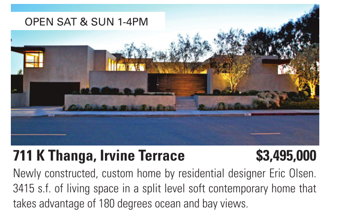 711 K Thanga, Irvine Terrace $3,495,000 Newly constructed, custom home by residential designer Eric Olsen. 3415 s.f. of living space in a split level soft contemporary home that takes advantage of 180 degrees ocean and bay views.