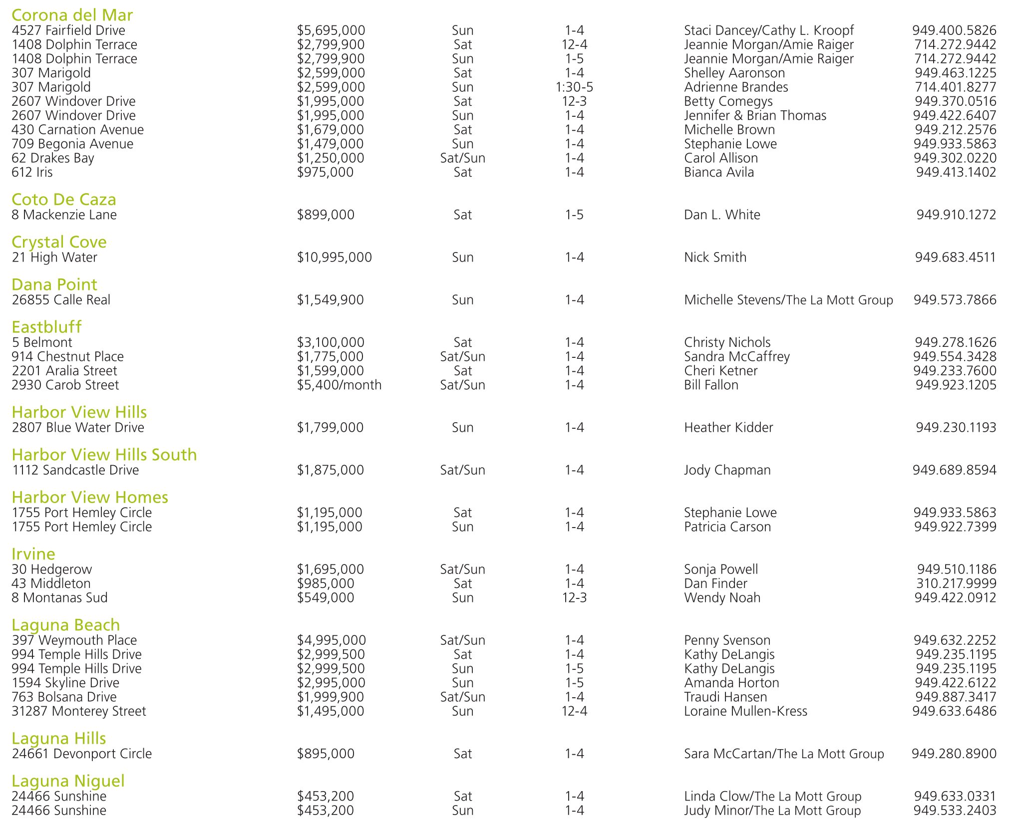 Corona del Mar 4527 Fairfield Drive $5,695,000 Sun 1-4 Staci Dancey/Cathy L. Kroopf 949.400.5826 1408 Dolphin Terrace $2,799,900 Sat 12-4 Jeannie Morgan/Amie Raiger 714.272.9442 1408 Dolphin Terrace $2,799,900 Sun 1-5 Jeannie Morgan/Amie Raiger 714.272.9442 307 Marigold $2,599,000 Sat 1-4 Shelley Aaronson 949.463.1225 307 Marigold $2,599,000 Sun 1:30-5 Adrienne Brandes 714.401.8277 2607 Windover Drive $1,995,000 Sat 12-3 Betty Comegys 949.370.0516 2607 Windover Drive $1,995,000 Sun 1-4 Jennifer & Brian Thomas 949.422.6407 430 Carnation Avenue $1,679,000 Sat 1-4 Michelle Brown 949.212.2576 709 Begonia Avenue $1,479,000 Sun 1-4 Stephanie Lowe 949.933.5863 62 Drakes Bay $1,250,000 Sat/Sun 1-4 Carol Allison 949.302.0220 612 Iris $975,000 Sat 1-4 Bianca Avila 949.413.1402 Coto De Caza 8 Mackenzie Lane $899,000 Sat 1-5 Dan L. White 949.910.1272 Crystal Cove 21 High Water $10,995,000 Sun 1-4 Nick Smith 949.683.4511 Dana Point 26855 Calle Real $1,549,900 Sun 1-4 Michelle Stevens/The La Mott Group 949.573.7866 Eastbluff 5 Belmont $3,100,000 Sat 1-4 Christy Nichols 949.278.1626 914 Chestnut Place $1,775,000 Sat/Sun 1-4 Sandra McCaffrey 949.554.3428 2201 Aralia Street $1,599,000 Sat 1-4 Cheri Ketner 949.233.7600 2930 Carob Street $5,400/month Sat/Sun 1-4 Bill Fallon 949.923.1205 Harbor View Hills 2807 Blue Water Drive $1,799,000 Sun 1-4 Heather Kidder 949.230.1193 Harbor View Hills South 1112 Sandcastle Drive $1,875,000 Sat/Sun 1-4 Jody Chapman 949.689.8594 Harbor View Homes 1755 Port Hemley Circle $1,195,000 Sat 1-4 Stephanie Lowe 949.933.5863 1755 Port Hemley Circle $1,195,000 Sun 1-4 Patricia Carson 949.922.7399 Irvine 30 Hedgerow $1,695,000 Sat/Sun 1-4 Sonja Powell 949.510.1186 43 Middleton $985,000 Sat 1-4 Dan Finder 310.217.9999 8 Montanas Sud $549,000 Sun 12-3 Wendy Noah 949.422.0912 Laguna Beach 397 Weymouth Place $4,995,000 Sat/Sun 1-4 Penny Svenson 949.632.2252 994 Temple Hills Drive $2,999,500 Sat 1-4 Kathy DeLangis 949.235.1195 994 Temple Hills Drive $2,999,500 Sun 1-5 Kathy DeLangis 949.235.1195 1594 Skyline Drive $2,995,000 Sun 1-5 Amanda Horton 949.422.6122 763 Bolsana Drive $1,999,900 Sat/Sun 1-4 Traudi Hansen 949.887.3417 31287 Monterey Street $1,495,000 Sun 12-4 Loraine Mullen-Kress 949.633.6486 Laguna Hills 24661 Devonport Circle $895,000 Sat 1-4 Sara McCartan/The La Mott Group 949.280.8900 Laguna Niguel 24466 Sunshine $453,200 Sat 1-4 Linda Clow/The La Mott Group 949.633.0331 24466 Sunshine $453,200 Sun 1-4 Judy Minor/The La Mott Group 949.533.2403