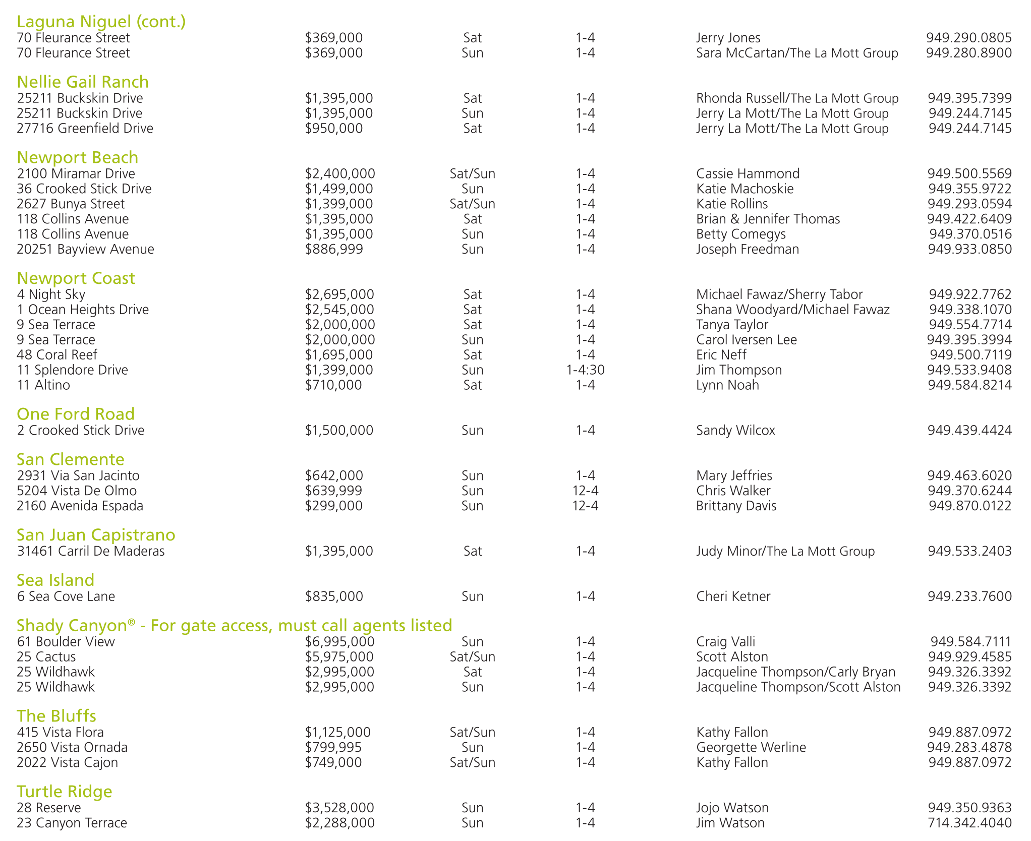 Laguna Niguel (cont.) 70 Fleurance Street $369,000 Sat 1-4 Jerry Jones 949.290.0805 70 Fleurance Street $369,000 Sun 1-4 Sara McCartan/The La Mott Group 949.280.8900 Nellie Gail Ranch 25211 Buckskin Drive $1,395,000 Sat 1-4 Rhonda Russell/The La Mott Group 949.395.7399 25211 Buckskin Drive $1,395,000 Sun 1-4 Jerry La Mott/The La Mott Group 949.244.7145 27716 Greenfield Drive $950,000 Sat 1-4 Jerry La Mott/The La Mott Group 949.244.7145 Newport Beach 2100 Miramar Drive $2,400,000 Sat/Sun 1-4 Cassie Hammond 949.500.5569 36 Crooked Stick Drive $1,499,000 Sun 1-4 Katie Machoskie 949.355.9722 2627 Bunya Street $1,399,000 Sat/Sun 1-4 Katie Rollins 949.293.0594 118 Collins Avenue $1,395,000 Sat 1-4 Brian & Jennifer Thomas 949.422.6409 118 Collins Avenue $1,395,000 Sun 1-4 Betty Comegys 949.370.0516 20251 Bayview Avenue $886,999 Sun 1-4 Joseph Freedman 949.933.0850 Newport Coast 4 Night Sky $2,695,000 Sat 1-4 Michael Fawaz/Sherry Tabor 949.922.7762 1 Ocean Heights Drive $2,545,000 Sat 1-4 Shana Woodyard/Michael Fawaz 949.338.1070 9 Sea Terrace $2,000,000 Sat 1-4 Tanya Taylor 949.554.7714 9 Sea Terrace $2,000,000 Sun 1-4 Carol Iversen Lee 949.395.3994 48 Coral Reef $1,695,000 Sat 1-4 Eric Neff 949.500.7119 11 Splendore Drive $1,399,000 Sun 1-4:30 Jim Thompson 949.533.9408 11 Altino $710,000 Sat 1-4 Lynn Noah 949.584.8214 One Ford Road 2 Crooked Stick Drive $1,500,000 Sun 1-4 Sandy Wilcox 949.439.4424 San Clemente 2931 Via San Jacinto $642,000 Sun 1-4 Mary Jeffries 949.463.6020 5204 Vista De Olmo $639,999 Sun 12-4 Chris Walker 949.370.6244 2160 Avenida Espada $299,000 Sun 12-4 Brittany Davis 949.870.0122 San Juan Capistrano 31461 Carril De Maderas $1,395,000 Sat 1-4 Judy Minor/The La Mott Group 949.533.2403 Sea Island 6 Sea Cove Lane $835,000 Sun 1-4 Cheri Ketner 949.233.7600 Shady Canyon ® - For gate access, must call agents listed 61 Boulder View $6,995,000 Sun 1-4 Craig Valli 949.584.7111 25 Cactus $5,975,000 Sat/Sun 1-4 Scott Alston 949.929.4585 25 Wildhawk $2,995,000 Sat 1-4 Jacqueline Thompson/Carly Bryan 949.326.3392 25 Wildhawk $2,995,000 Sun 1-4 Jacqueline Thompson/Scott Alston 949.326.3392 The Bluffs 415 Vista Flora $1,125,000 Sat/Sun 1-4 Kathy Fallon 949.887.0972 2650 Vista Ornada $799,995 Sun 1-4 Georgette Werline 949.283.4878 2022 Vista Cajon $749,000 Sat/Sun 1-4 Kathy Fallon 949.887.0972 Turtle Ridge 28 Reserve $3,528,000 Sun 1-4 Jojo Watson 949.350.9363 23 Canyon Terrace $2,288,000 Sun 1-4 Jim Watson 714.342.4040