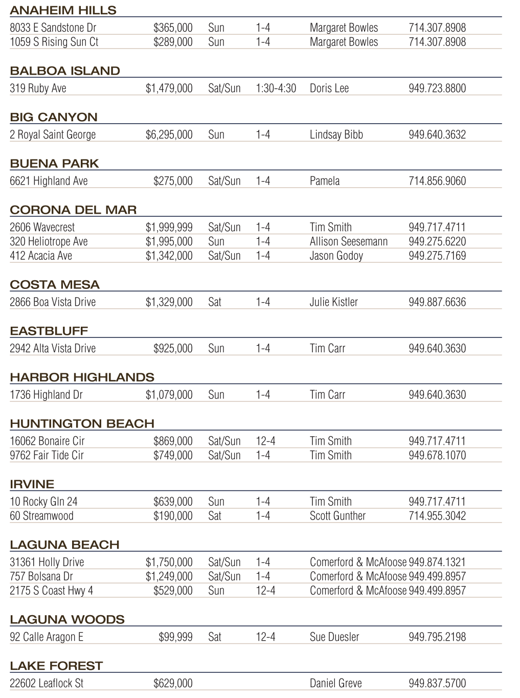 LAGUNA BEACH 31361 Holly Drive $1,750,000 Sat/Sun 1-4 Comerford & McAfoose 949.874.1321 757 Bolsana Dr $1,249,000 Sat/Sun 1-4 Comerford & McAfoose 949.499.8957 2175 S Coast Hwy 4 $529,000 Sun 12-4 Comerford & McAfoose 949.499.8957