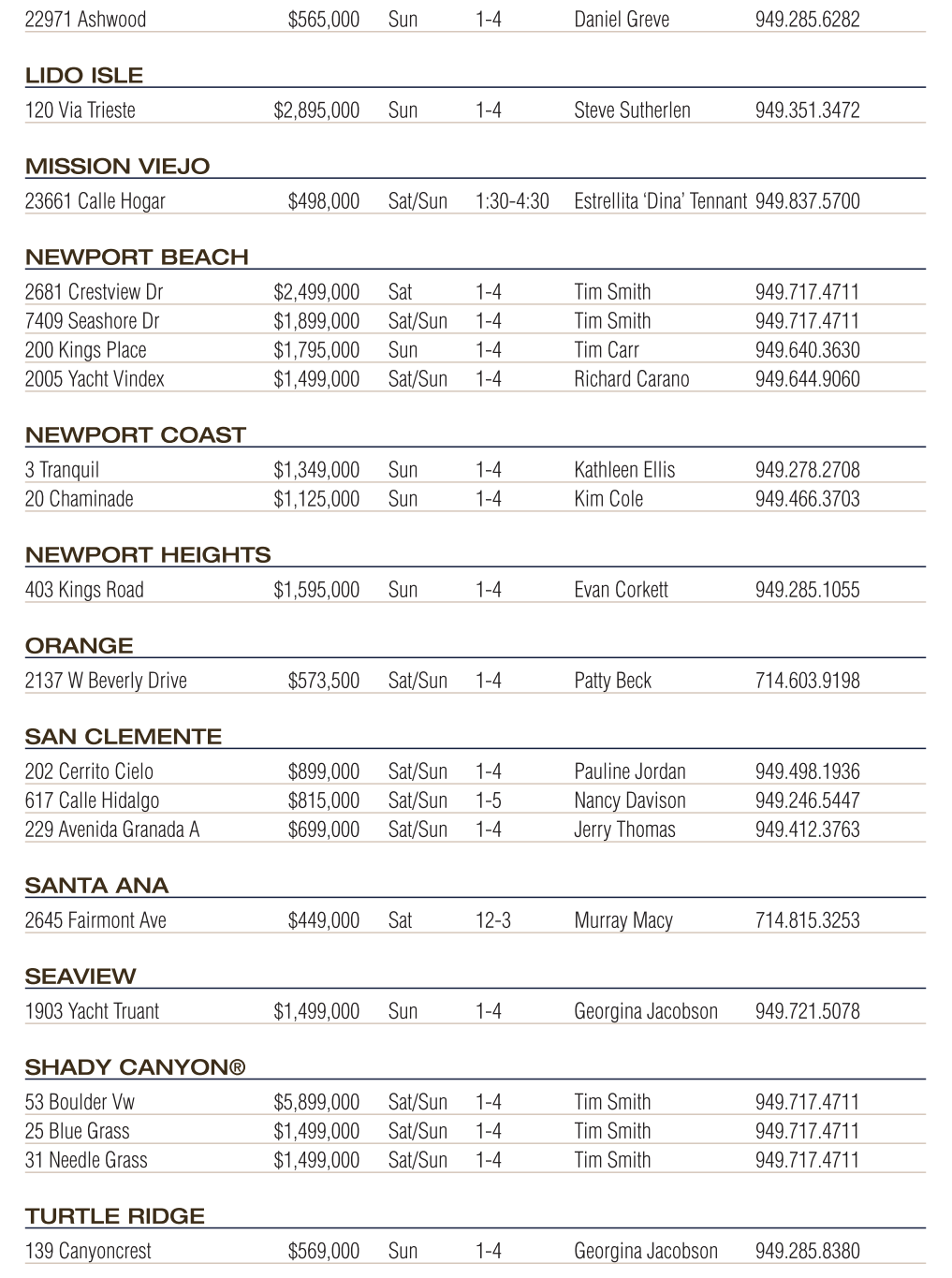 NEWPORT BEACH 2681 Crestview Dr $2,499,000 Sat 1-4 Tim Smith 949.717.4711 7409 Seashore Dr $1,899,000 Sat/Sun 1-4 Tim Smith 949.717.4711 200 Kings Place $1,795,000 Sun 1-4 Tim Carr 949.640.3630 2005 Yacht Vindex $1,499,000 Sat/Sun 1-4 Richard Carano 949.644.9060