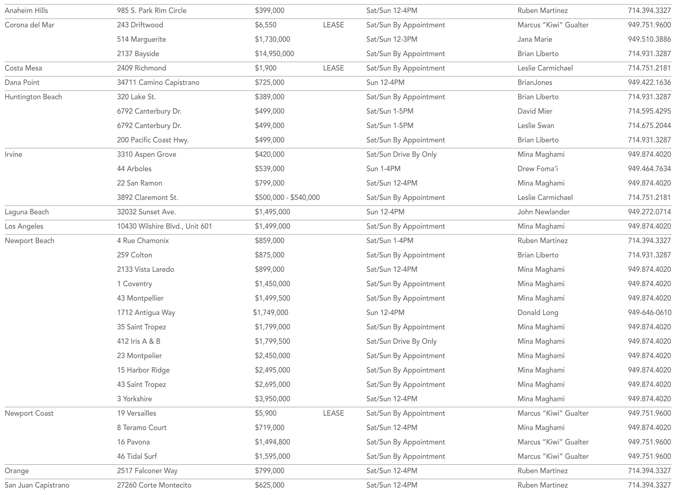16 Pavona $1,494,800 Sat/Sun By Appointment Marcus “Kiwi” Gualter 949.751.9600
