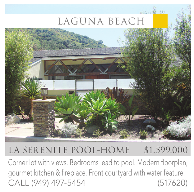 LA SERENITE POOL-HOME $1,599,000 Corner lot with views. Bedrooms lead to pool. Modern fl oorplan, gourmet kitchen & fireplace. Front courtyard with water feature. CALL (949) 497-5454 (517620)