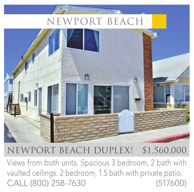 NEWPORT BEACH DUPLEX! $1,560,000 Views from both units. Spacious 3 bedroom, 2 bath with vaulted ceilings. 2 bedroom, 1.5 bath with private patio. CALL (800) 258-7630 (517600)