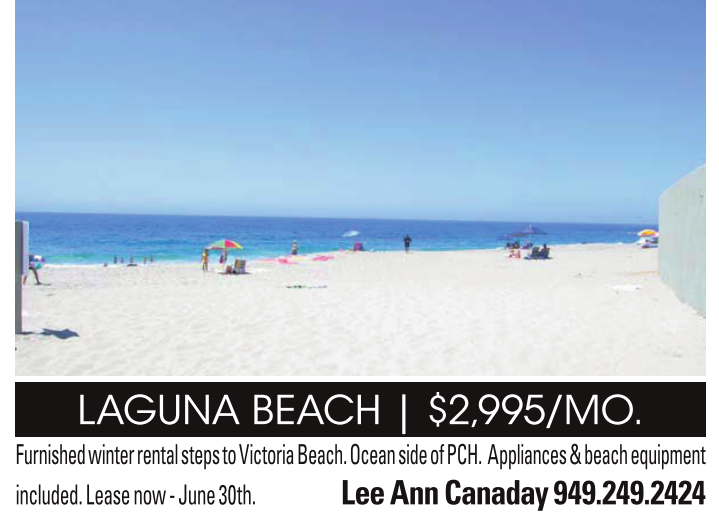 Furnished winter rental steps to Victoria Beach. Ocean side of PCH. Appliances & beach equipment included. Lease now - June 30th. Lee Ann Canaday 949.249.2424