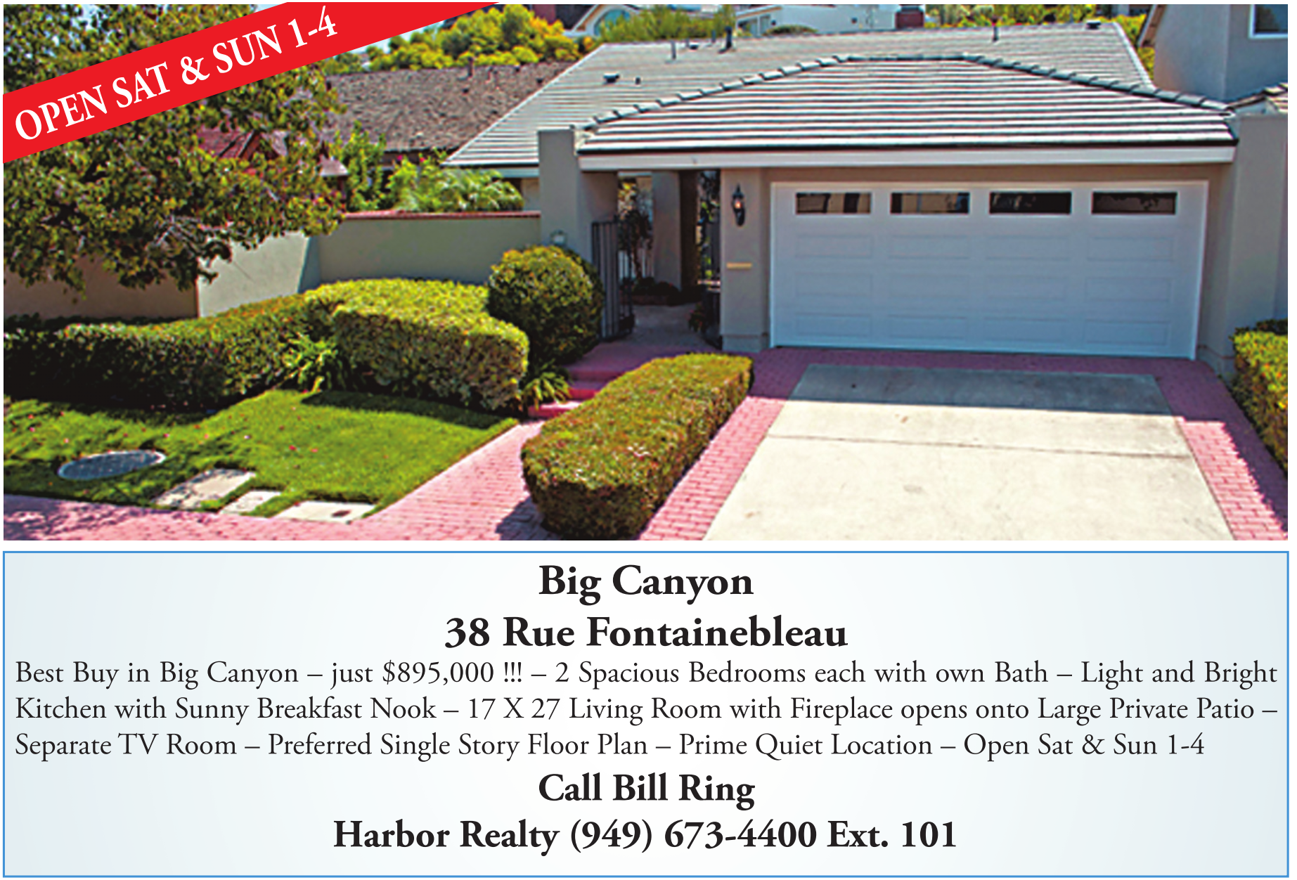 Big Canyon 38 Rue Fontainebleau Best Buy in Big Canyon – just $895,000 !!! – 2 Spacious Bedrooms each with own Bath – Light and Bright Kitchen with Sunny Breakfast Nook – 17 X 27 Living Room with Fireplace opens onto Large Private Patio – Separate TV Room – Preferred Single Story Floor Plan – Prime Quiet Location – Open Sat & Sun 1-4 Call Bill Ring Harbor Realty (949) 673-4400 Ext. 101