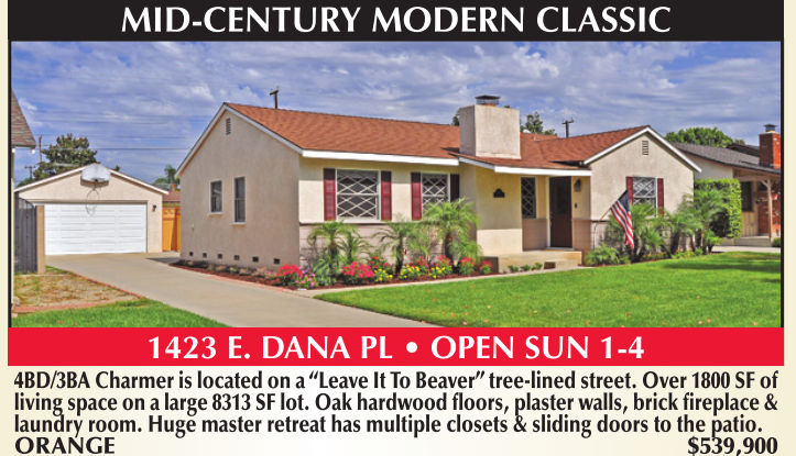 MID-CENTURY MODERN CLASSIC 1423 E. DANA PL • OPEN SUN 1-4 4BD/3BA Charmer is located on a “Leave It To Beaver” tree-lined street. Over 1800 SF of living space on a large 8313 SF lot. Oak hardwood floors, plaster walls, brick fireplace & laundry room. Huge master retreat has multiple closets & sliding doors to the patio. ORANGE $539,900