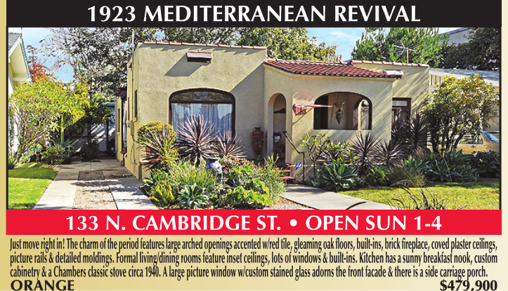 1923 MEDITERRANEAN REVIVAL 133 N. CAMBRIDGE ST. • OPEN SUN 1-4 Just move right in! The charm of the period features large arched openings accented w/red tile, gleaming oak floors, built-ins, brick fireplace, coved plaster ceilings, picture rails & detailed moldings. Formal living/dining rooms feature inset ceilings, lots of windows & built-ins. Kitchen has a sunny breakfast nook, custom cabinetry & a Chambers classic stove circa 1940. A large picture window w/custom stained glass adorns the front facade & there is a side carriage porch. ORANGE $479,900