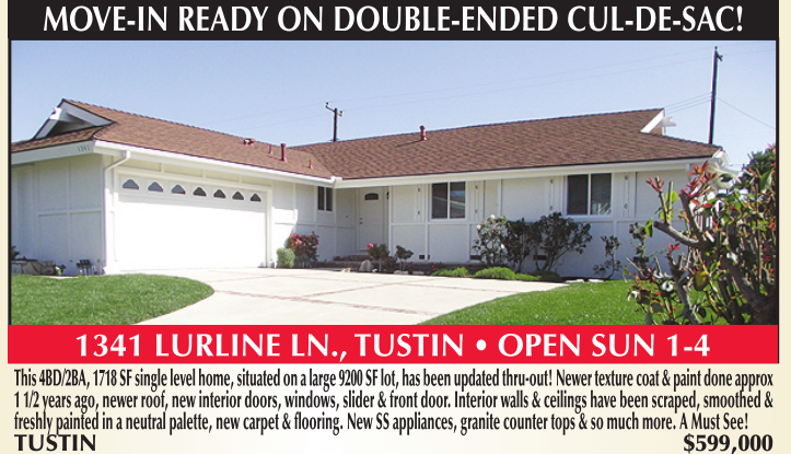 MOVE-IN READY ON DOUBLE-ENDED CUL-DE-SAC! 1341 LURLINE LN., TUSTIN • OPEN SUN 1-4 This 4BD/2BA, 1718 SF single level home, situated on a large 9200 SF lot, has been updated thru-out! Newer texture coat & paint done approx 1 1/2 years ago, newer roof, new interior doors, windows, slider & front door. Interior walls & ceilings have been scraped, smoothed & freshly painted in a neutral palette, new carpet & flooring. New SS appliances, granite counter tops & so much more. A Must See! TUSTIN $599,000