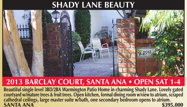 SHADY LANE BEAUTY 2013 BARCLAY COURT, SANTA ANA • OPEN SAT 1-4 Beautiful single level 3BD/2BA Warmington Patio Home in charming Shady Lane. Lovely gated courtyard w/mature trees & fruit trees. Open kitchen, formal dining room w/view to atrium, scraped cathedral ceilings, large master suite w/bath, one secondary bedroom opens to atrium. SANTA ANA $395,000