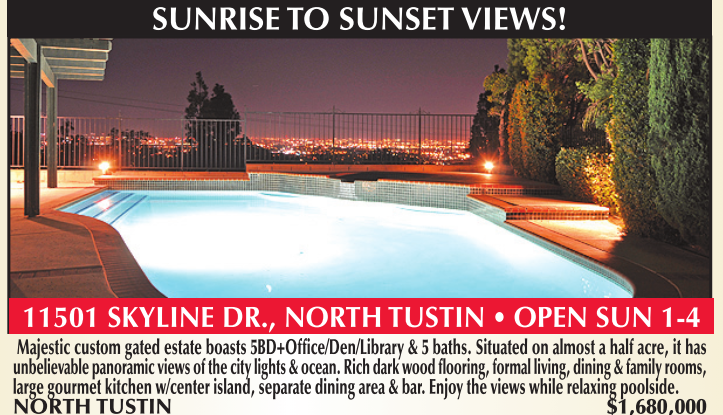 SUNRISE TO SUNSET VIEWS! 11501 SKYLINE DR., NORTH TUSTIN • OPEN SUN 1-4 Majestic custom gated estate boasts 5BD+Office/Den/Library & 5 baths. Situated on almost a half acre, it has unbelievable panoramic views of the city lights & ocean. Rich dark wood flooring, formal living, dining & family rooms, large gourmet kitchen w/center island, separate dining area & bar. Enjoy the views while relaxing poolside. NORTH TUSTIN $1,680,000