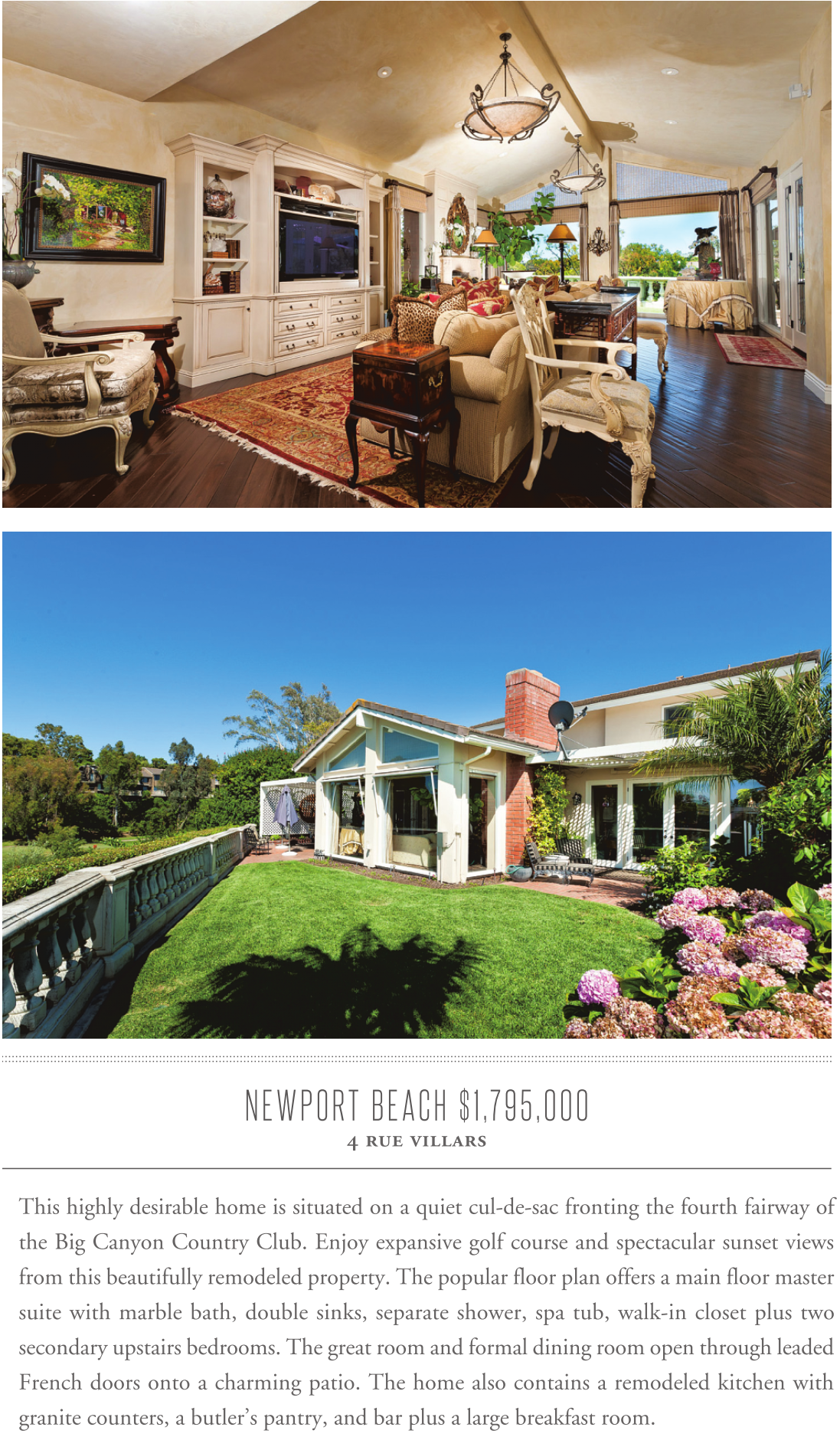 This highly desirable home is situated on a quiet cul-de-sac fronting the fourth fairway of the Big Canyon Country Club. Enjoy expansive golf course and spectacular sunset views from this beautifully remodeled property. The popular floor plan offers a main floor master suite with marble bath, double sinks, separate shower, spa tub, walk-in closet plus two secondary upstairs bedrooms. The great room and formal dining room open through leaded French doors onto a charming patio. The home also contains a remodeled kitchen with granite counters, a butler’s pantry, and bar plus a large breakfast room.