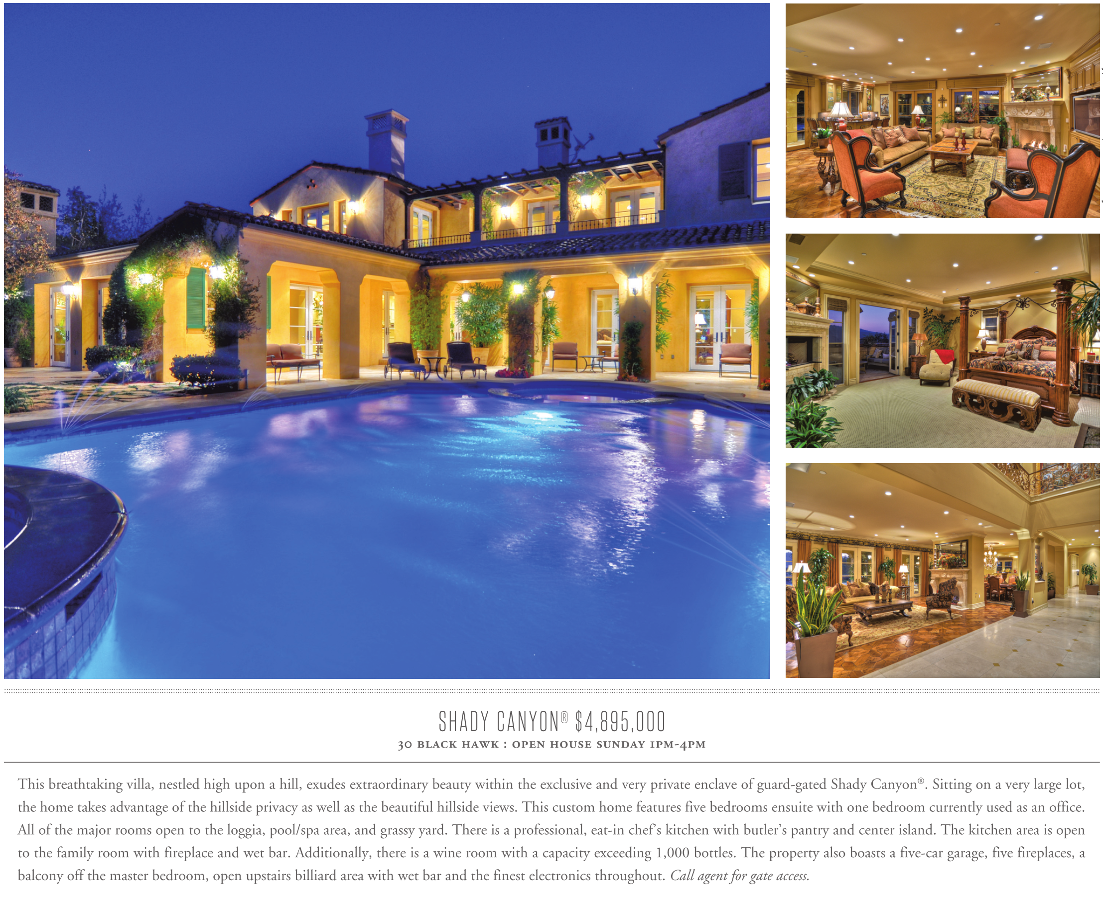 This breathtaking villa, nestled high upon a hill, exudes extraordinary beauty within the exclusive and very private enclave of guard-gated Shady Canyon ® . Sitting on a very large lot, the home takes advantage of the hillside privacy as well as the beautiful hillside views. This custom home features five bedrooms ensuite with one bedroom currently used as an office. All of the major rooms open to the loggia, pool/spa area, and grassy yard. There is a professional, eat-in chef’s kitchen with butler’s pantry and center island. The kitchen area is open to the family room with fireplace and wet bar. Additionally, there is a wine room with a capacity exceeding 1,000 bottles. The property also boasts a five-car garage, five fireplaces, a balcony off the master bedroom, open upstairs billiard area with wet bar and the finest electronics throughout. Call agent for gate access.