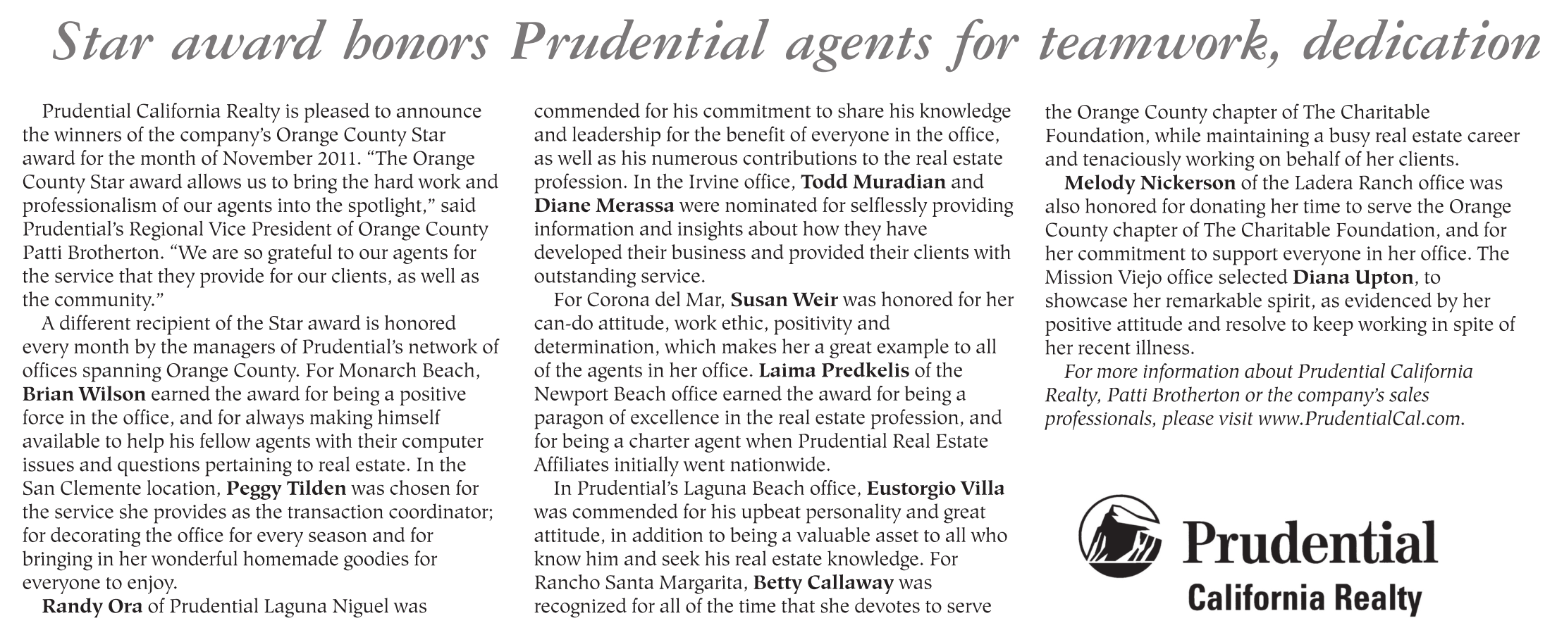Prudential California Realty is pleased to announce the winners of the company’s Orange County Star award for the month of November 2011. “The Orange County Star award allows us to bring the hard work and professionalism of our agents into the spotlight,” said Prudential’s Regional Vice President of Orange County Patti Brotherton. “We are so grateful to our agents for the service that they provide for our clients, as well as the community.”