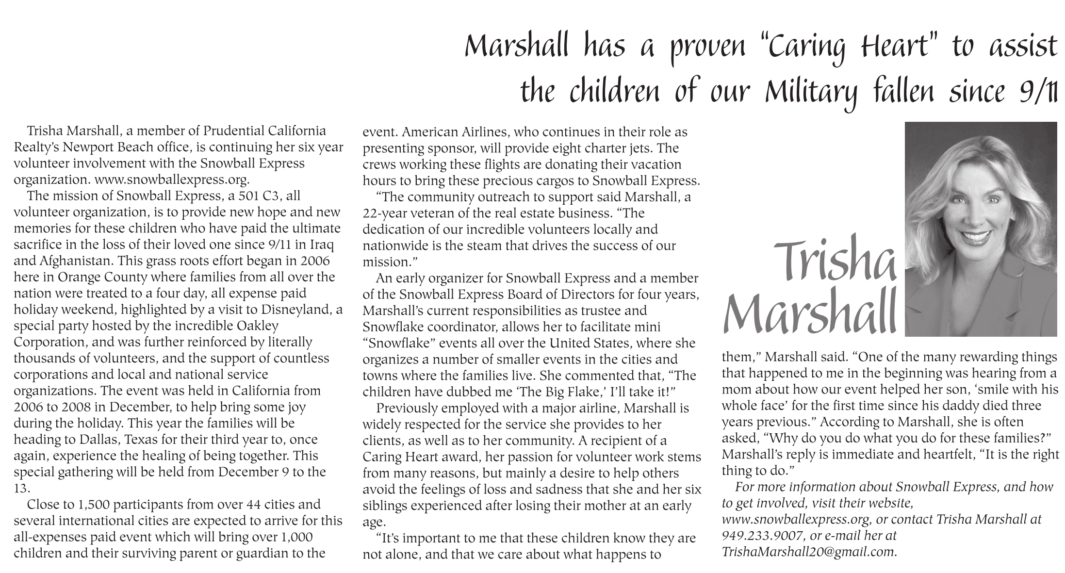 Trisha Marshall, a member of Prudential California Realty’s Newport Beach office, is continuing her six year volunteer involvement with the Snowball Express organization. www.snowballexpress.org.
